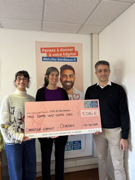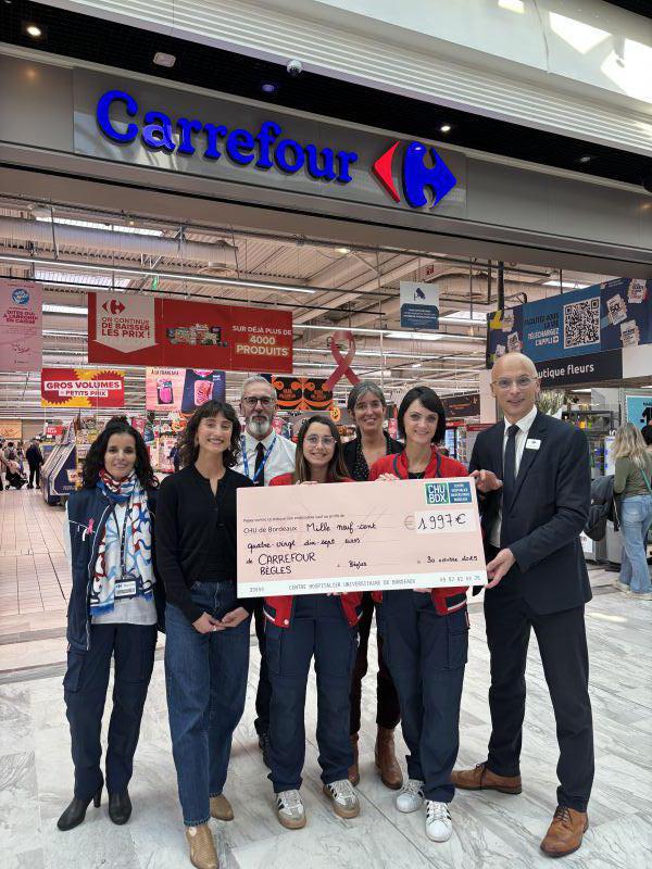Dans le cadre de l'opération solidaire « Les Boucles du Cœur », les hypermarchés Carrefour de Mérignac, Bègles et Lormont ont choisi de soutenir le CHU de Bordeaux. Grâce à leur engagement, 9 772 € ont été collectés en faveur de l'hôpital des Enfants, spécifiquement pour le projet de création d'un plateau d'explorations fonctionnelles pédiatriques.