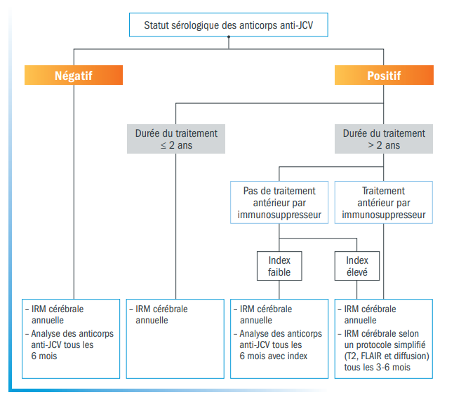 Le Natalizumab (TYSABRI intraveineux ou sous-cutané / TYRUKO biosimilaire intra-veineux) de part son mécanisme d'action et les données accumulées depuis sa mise sur le marché est le seul traitement de la SEP pour lequel une surveillance du virus JC est nécessaire, et aujourd'hui très encadrée et protocolarisée.